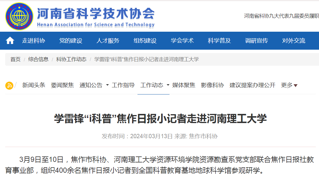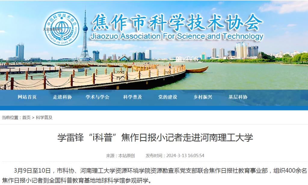 资勘系党支部按照新时代党建要求,以建设中国特色世界一流的地质资源与地质工程学科为目标,探索建立起以立德树人为核心,以一流学科建设和一流本科建设为两翼的党建工作体系,走出了一条“‘党建+’奏响立德树人”高校党建特色之路,受到河南日报客户端、”学习强国”学习平台、河南日报农村版等主流媒体广泛报道,党支部三级联创相关活动受到河南省科学技术协会、焦作市科学技术协会、焦作晚报、焦作日报教育之声视频号等媒体报道,引发热烈反响。相关内容如下: