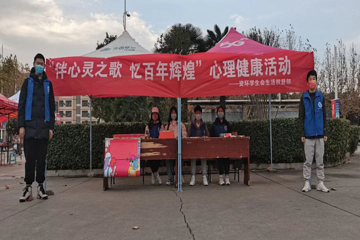 学生会生活权益部在学苑餐厅东门举行了“伴心灵之歌,忆百年辉煌”心理健康文化活动。