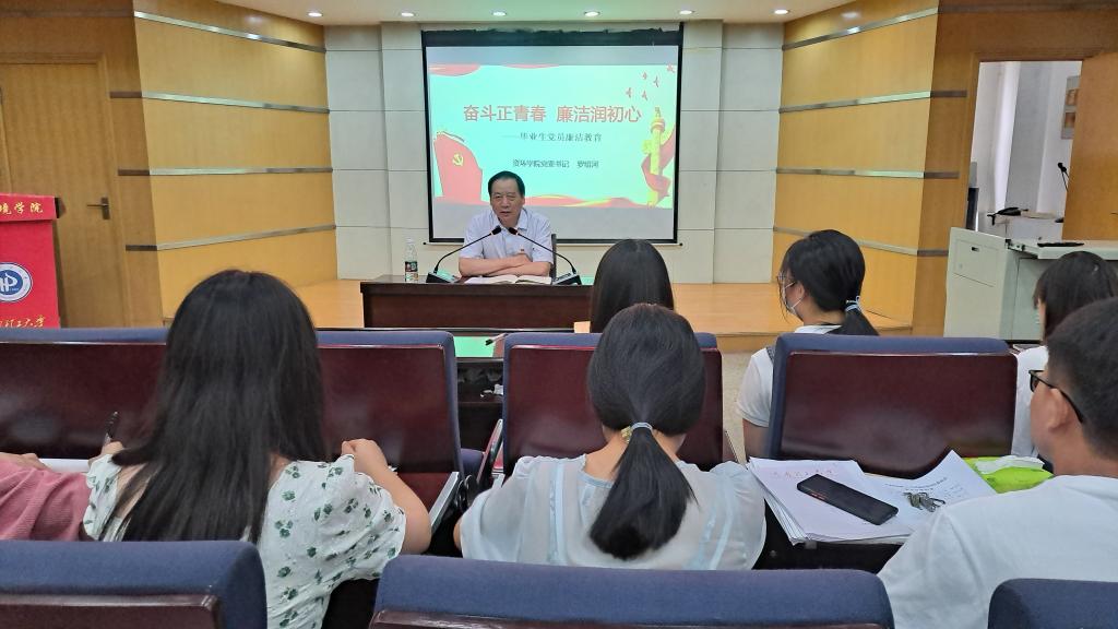 在影像厅开展了毕业生党员廉洁教育活动,院党委书记罗绍河以《奋斗正青春,廉洁润初心》为主题给即将离校的毕业生党员上了大学“最后一堂党课”,院党委副书记、毕业班辅导员和毕业生党员代表参加。