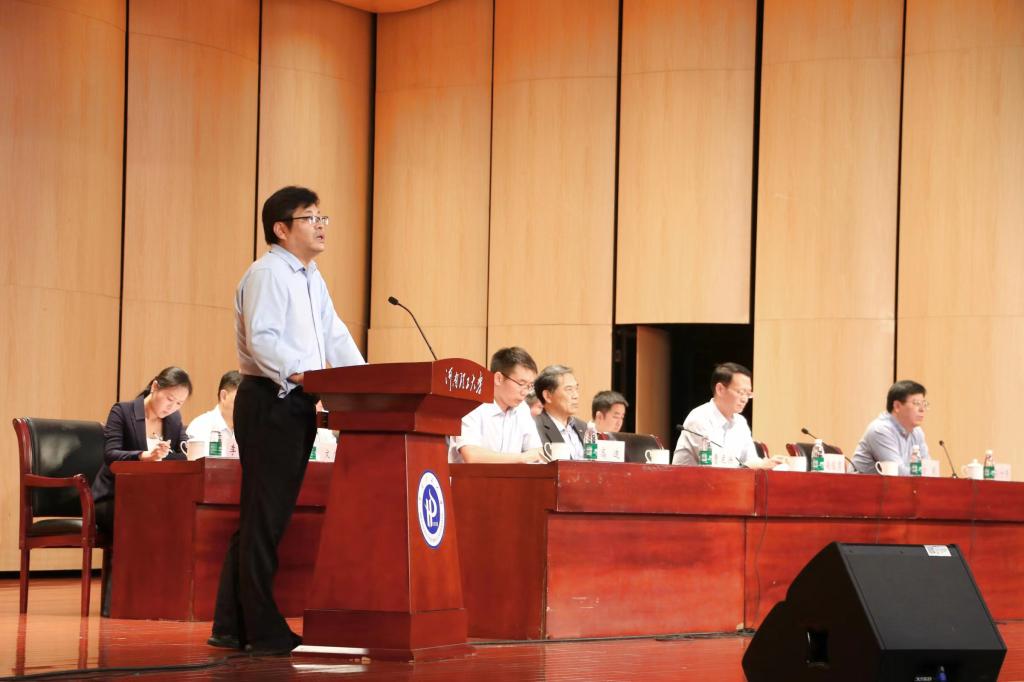 在庄严的国歌声中,会议拉开帷幕。首先,加拿大工程院院士曹运兴发言。他结合自身经历,对新生提出三点希望:第一,提升英语能力,为今后的科研学习打下坚实基础。第二,继续加强基础学科的学习,并不断扩展自己的知识领域。第三,传承和发扬“好学力行”的校风,身体力行,奋力实践。