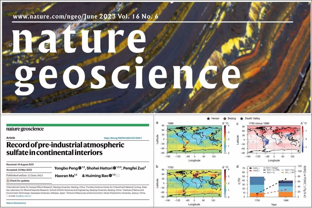 青年教师左鹏飞博士与南京大学鲍惠铭、彭永波教授合作以共同作者在国际地学顶刊《自然-地球科学》(《Nature Geoscience》),发表题为《陆内工业化前大气中硫酸盐的记录》(《Record of pre-industrial atmospheric sulfate in continental interiors》)的研究成果,实现了学院顶级学术成果的历史性突破。