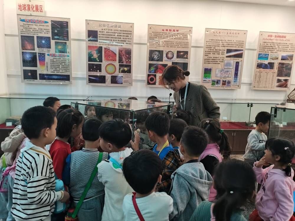 讲解志愿者们以饱满的热情、严谨的科学态度和通俗易懂的语言,通过展馆内地球演化、痕迹化石、矿物与矿产资源的3个展区的标本、模型、图片等为幼儿园小朋友们从不同角度讲述了几十亿年中地球上物质和生命演化的神奇过程。将近2个小时的讲解,让小朋友们感到非常新鲜,他们用一双双好奇的小眼睛认真寻找着课堂与自然的差别。从叠层石、三叶虫、到中华鲟、周氏黔鱼龙;从硅化木、海百合、到鹦鹉嘴龙、紫晶洞;这一组组绚丽多姿、几经沧海的标本化石,让孩子们在欢声笑语中感受到知识的力量和生命的神奇。
