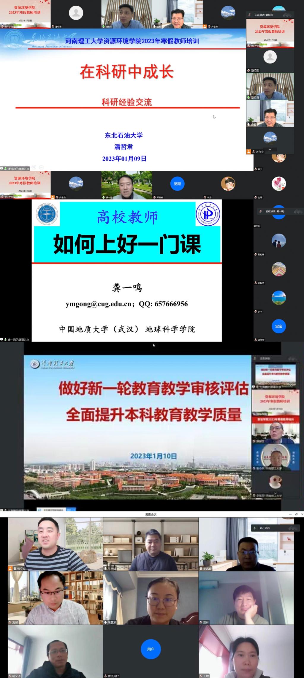 本次寒假教师培训包括四个单元,采用线上统一培训、集体讲授与系室分散自学的方式开展。9日上午,国际非常规天然气领域的知名专家、东北石油大学潘哲君教授应邀在线作了题为《在科研中成长》的报告,潘哲君结合自身在国内外求学、做科研的经历,根据他在不同成长阶段的研究工作为例,从“求学阶段应必备技能,职业生涯中的科研方法,注重理论与实践相结合,加强国际交流合作”等方面,为老师们详细讲解了如何做好科研工作及提升科研能力。最后潘哲君教授与学院教师就如何做好科研工作展开深入交流;9日下午,国家教学名师、中国地质大学(武汉)龚一鸣教授作了题为《高校教师如何上好一堂课》的报告。龚一鸣教授从教学的关键词“爱”入手,从自己30多年的教学经历总结出由4维度10策略和3环节10个要素构成的“双10联动”教学经验,逐一进行了详细阐述。龚一鸣教授的报告深入浅出,循古博今,受到了参会教师的一致好评;10日上午教务处处长牛海鹏以《做好新一轮教育教学审核评估,全面提升本科教育教学质量》为题,介绍了我国高等教育评估体系的发展历程和建设成果,阐述了新一轮审核评估的内容、要求、特点及评估流程,根据审核评估指标体系对我校的教育教学审核评估工作进行了详细解读和梳理;10日下午由学院各系室主任主持开展研讨会,围绕本科教育教学审核评估、一流本科专业建设、教学科研能力培养与提升等方面进行了分组讨论。