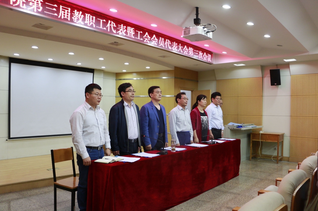 第三届教职工代表暨工会会员代表大会第三次会议在影像厅召开。院党委书记张贵江,院长齐永安,党委副书记、学院分工会主席许传阳,副院长王海邻,副院长郑德顺,副院长金毅及代表参加会议。会议由许传阳主持。