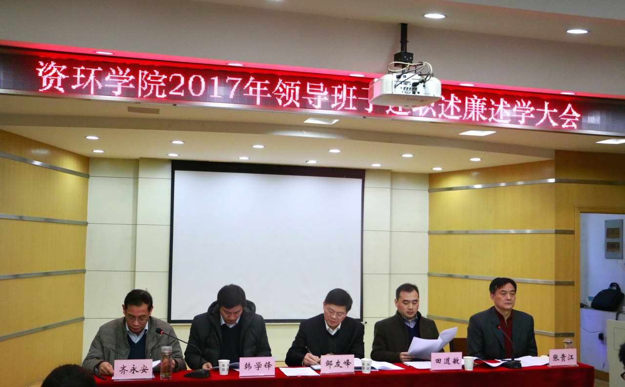 领导班子述职述廉述学大会暨院长抓发展述职大会并发表重要讲话。他结合2017年学校的人事变动、学校的各项事业大发展,对学院2017年工作成绩给予肯定的同时对学院的工作进行了点评并对下一步工作提出了要求。邹友峰指出,2017年学院在基层党建、科研及平台建设、学科竞赛、论文数量和质量、教师出国深造、学生考研录取率等工作中都取得了不错的成绩,2018年,学院应结合学校十三五发展规划,联系学院实际,坚持全面从严治党,加强基层党建工作和反腐倡廉工作;采取“走出去、引进来”策略,鼓励学院教师出国深造,加大高层次人才引进力度;提高教育教学水平,狠抓科研成果获奖,加大新博士学位授权点建设和申报力度,争取获奖成果有更大突破,力争学科排名继续提高;希望学院各学科相互学习、共同进步、全面开花。邹友峰强调, 新一年,我们要在习近平新时代中国特色社会主义思想指引下,进一步贯彻落实党的十九大精神和全国全省高校思想政治工作会议精神,以内涵建设为基础,以特色发展为路径,开启学校工作新征程,开创学校工作新局面。最后,邹友峰对教师们的支持表示感谢并提前致以新年的问候。