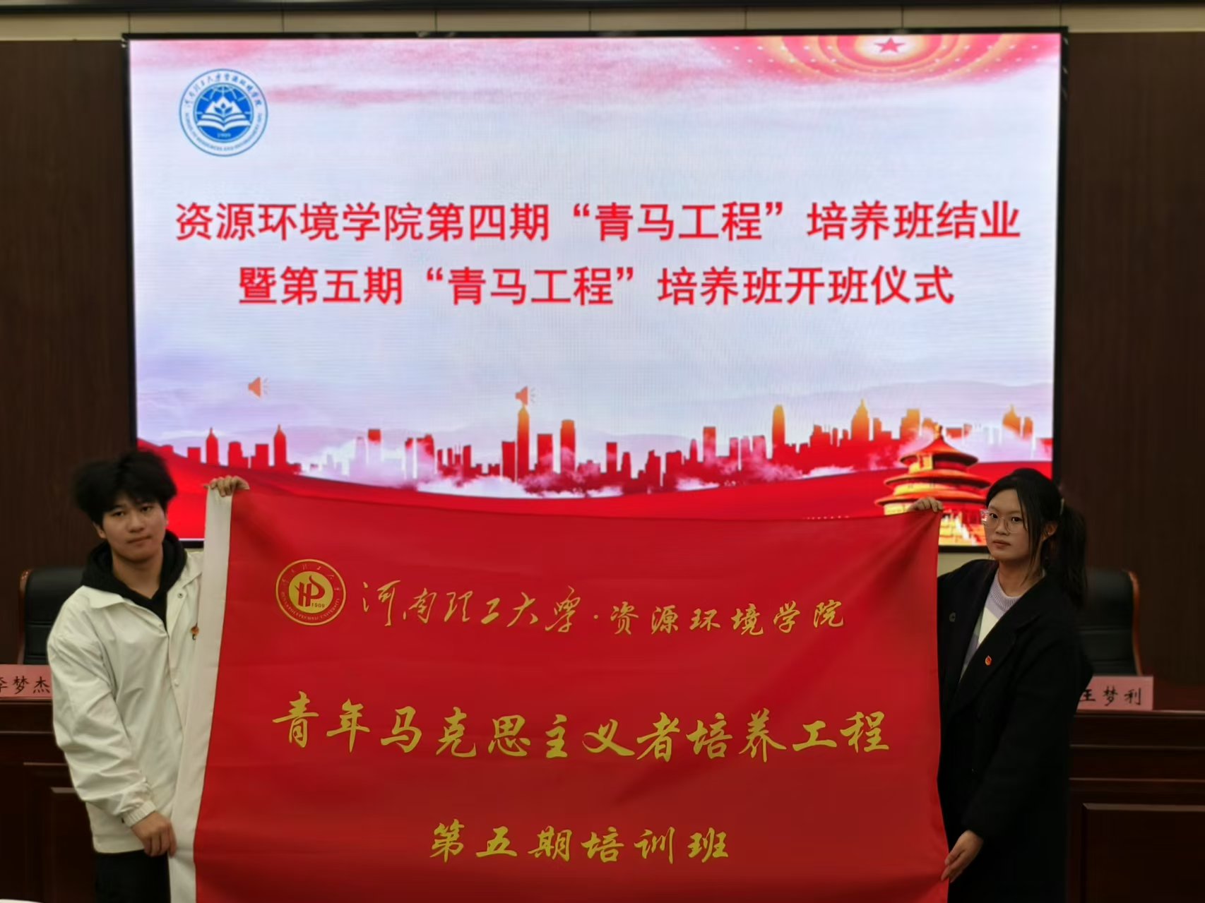 第I学术报告厅举行第四期“青马工程”培养班结业暨第五期“青马工程”培养班开班仪式。院党委书记桑俊勇、院党委副书记孙付伟、院专职组织员武宝宝、院团委副书记王梦利和2023级辅导员李梦杰参加仪式。仪式由孙付伟主持。