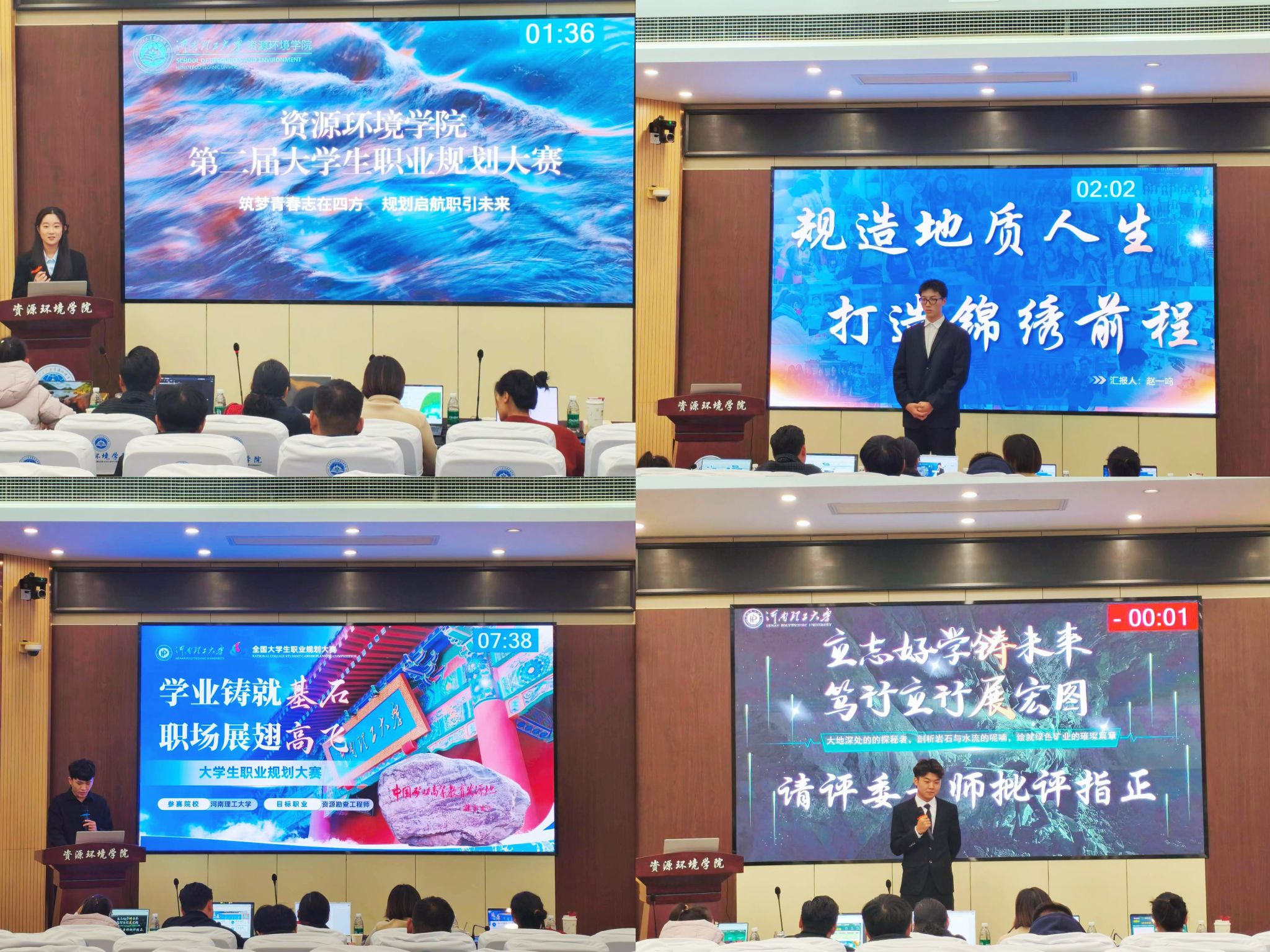 在资环楼第Ⅰ学术报告厅举办第二届大学生职业规划大赛。院团委副书记王梦利,研究生辅导员杨英、21级辅导员王静、23级辅导员李梦杰和24级辅导员杨澳伟担任本次大赛评委。