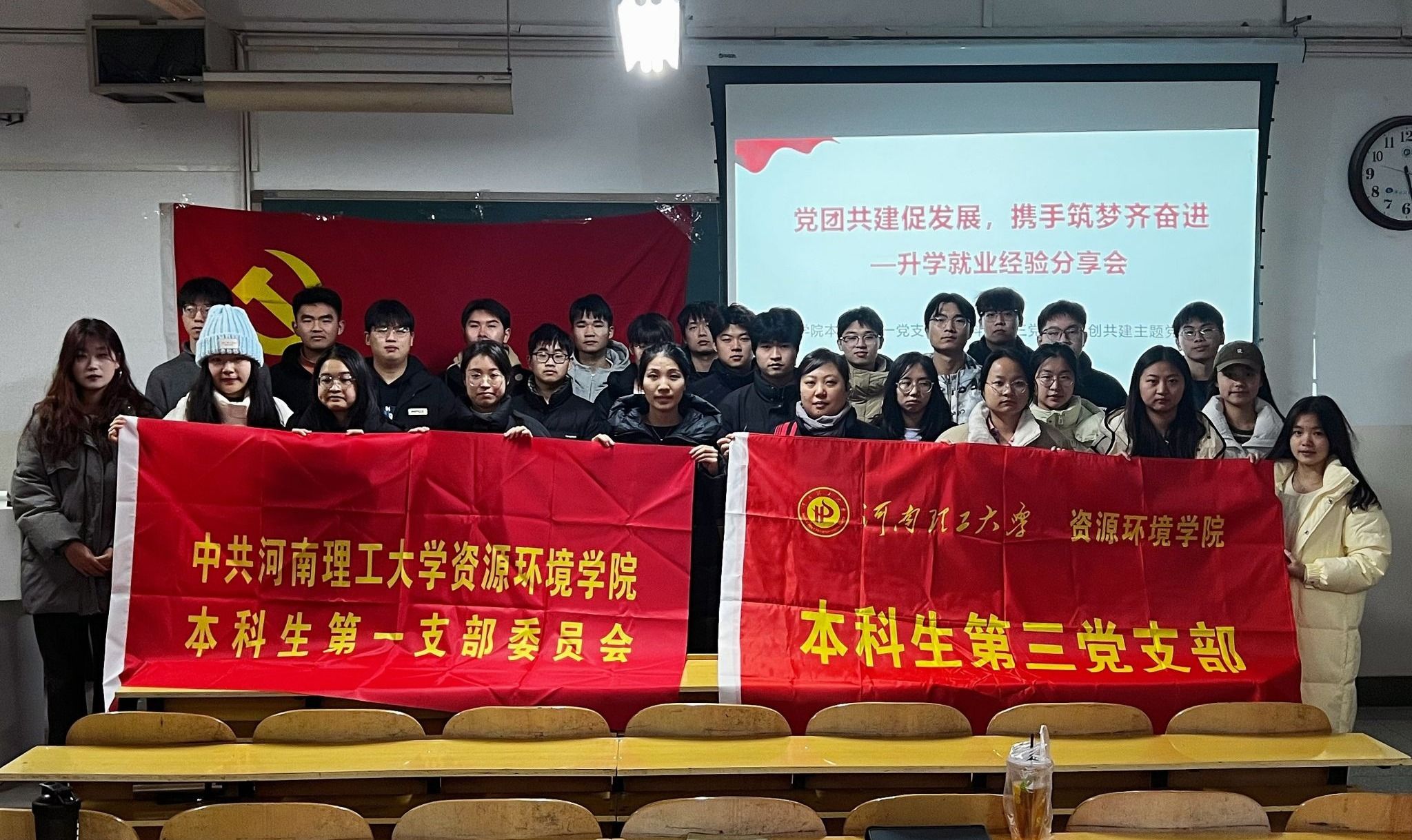 为加强党支部之间的交流与合作,充分发挥党员同志的先锋模范作用,12月12日下午,院本科生第一党支部与本科生第三党支部在资环楼402教室开展“党团共建促发展,携手筑梦齐奋进”升学就业经验分享活动,活动由韩嘉鑫主持。
