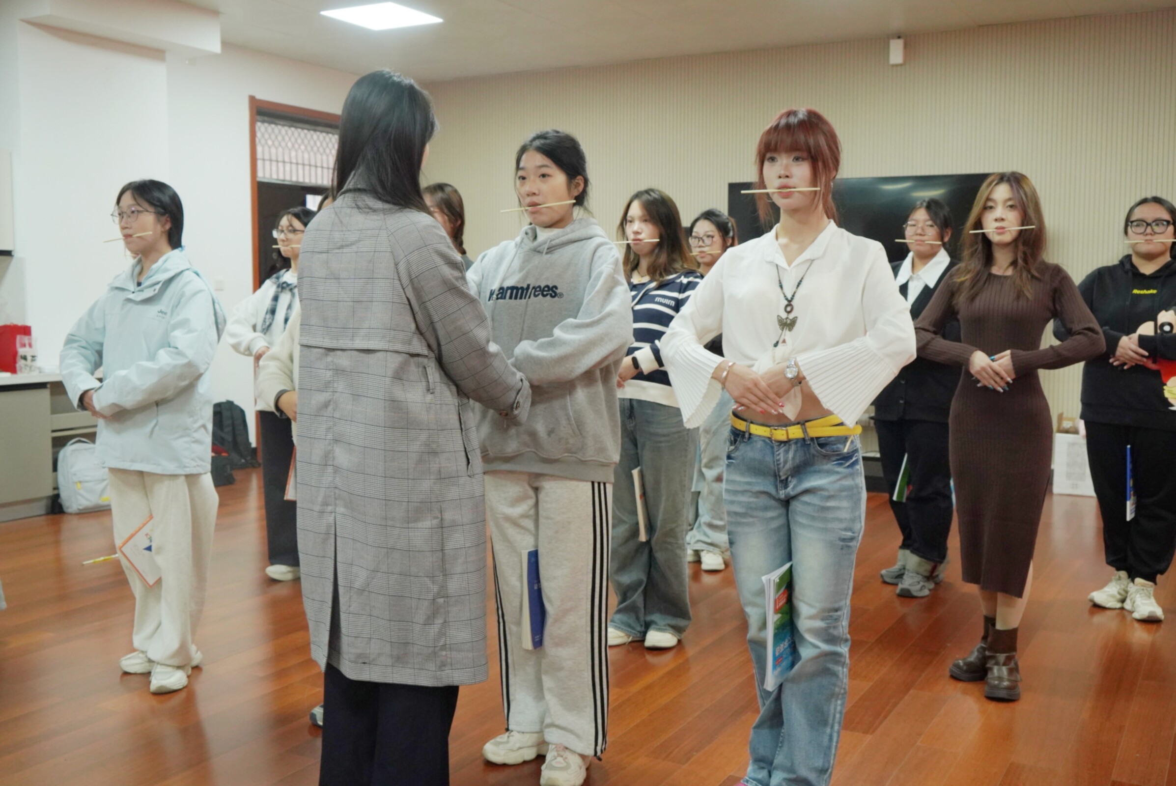 培训以“夯实核心技能,塑造专业形象”为目标,分三个环节有序推进:首先是基础形体训练:聚焦站姿规范,队员通过“双腿夹书练稳度”“牙咬筷子纠体态”等实用方法,练习标准丁字步与挺拔身姿。李淑宇逐一对队员的手位摆放、身体姿态进行纠正,并明确“高马尾、无美甲、不戴首饰”的出礼仪仪容标准,强化细节管理;其次是专项技能学习:针对礼仪工作场景,全体成员系统掌握引导手势的规范动作,同时结合不同颁奖对象拆解颁奖流程中的递物、微笑、话术配合等要点;最后是分组精准打磨:队员以小组为单位进行实操演练,李淑宇对每组的步速控制、整体仪态及颁奖动作细节逐一点评,提出“动作统一、眼神专注、微笑自然”的高标准要求,推动团队整体表现的规范化与一致性。