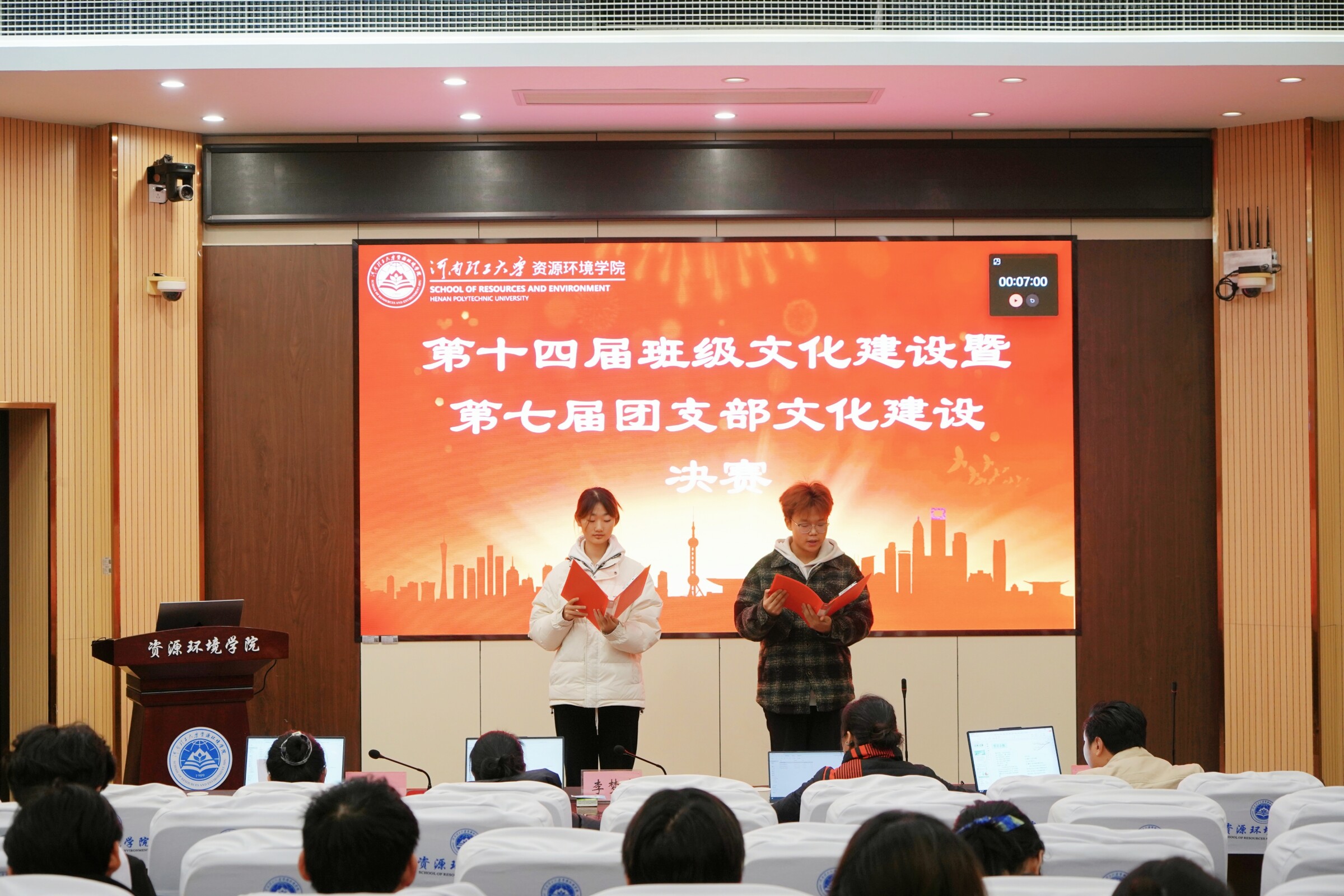 在12月11日中午于资环楼第I学术报告厅举办了第十四届班级文化建设暨第七届团支部文化建设决赛。2023级辅导员李梦杰、2024级辅导员杨澳伟以及2025级辅导员王静和薛梅担任评委。2025级的八支优秀队伍参与决赛。